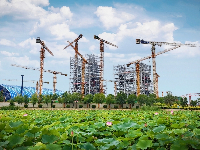 在荷塘的彼岸,塔吊高聳,焊花飛濺,鋼筋水泥在烈日下凝固成新的骨骼。建設者身著工裝,在鋼架上攀爬、焊接、澆筑。他們的臉龐被曬得通紅,汗水在安全帽邊緣匯成細流,滴落在滾燙的鋼板上,瞬間化作白煙??伤麄兊哪_步不曾停歇,手中的工具依舊精準有力。鍋爐房的輪廓在熱浪中日漸清晰,像一座正在蘇醒的鋼鐵巨獸,一寸寸拔地而起。