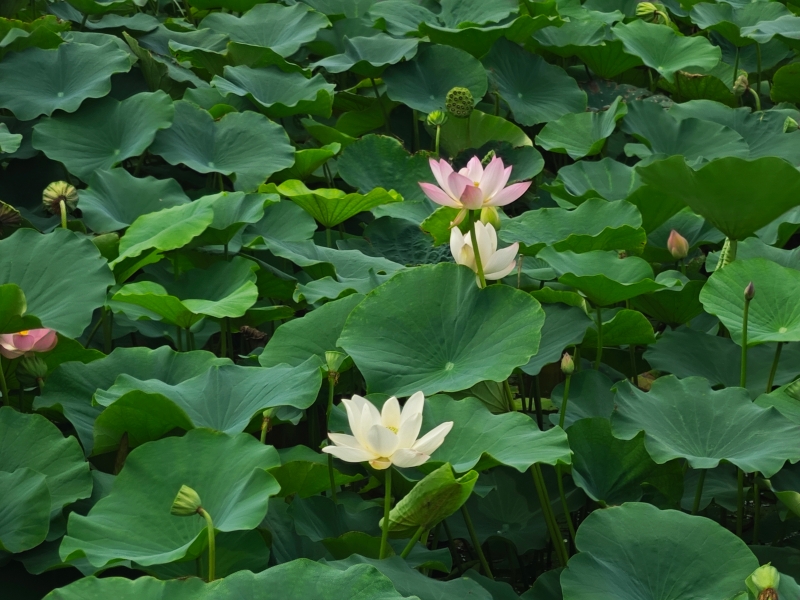 在施工現場邊緣,一片荷花池倔強地鋪展著生命的綠意。荷葉如蓋,層層疊疊,在滾燙的空氣中撐起一片片清涼的綠蔭。粉白的荷花,從淤泥中挺立而出,不懼烈日炙烤,不避塵土紛擾,在蒸騰的暑氣里,將花瓣一片片、一瓣瓣,倔強地舒展到極致。露珠在葉心滾動,像不肯融化的淚,映照著藍天與鋼架的倒影。它們不爭不搶,卻以靜默的綻放,宣告著生命對酷熱的蔑視。